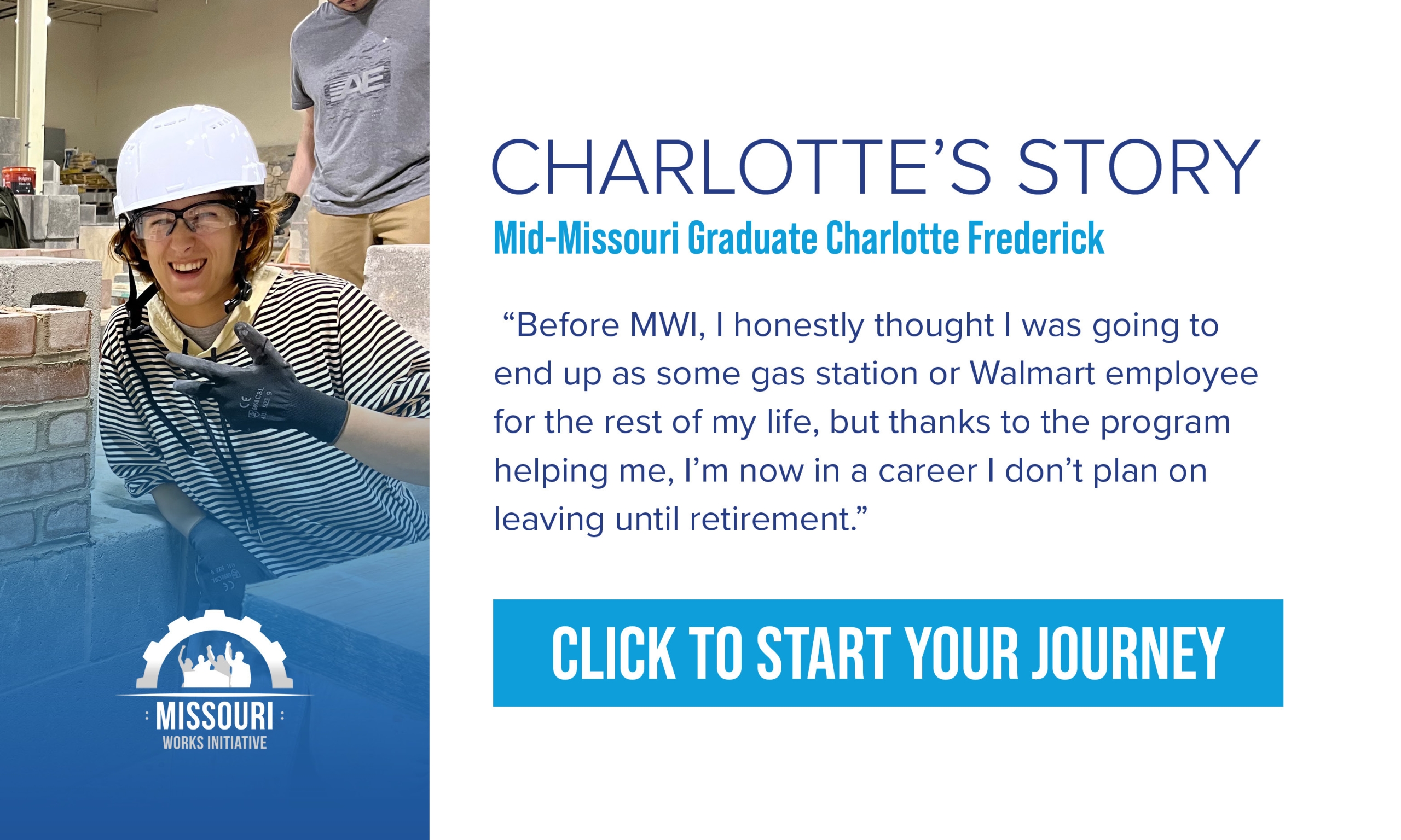 The Missouri Works Initiative Program gave Charlotte the skills and the confidence she needed to find a career that invests back in her, not just a job that barely pays the bills. “Before MWI, I honestly thought I was going to end up as some gas station or Walmart employee for the rest of my life, but thanks to the program helping me, I’m now in a career I don’t plan on leaving until retirement.”